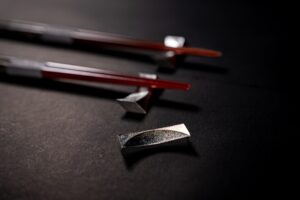 錫の魅力のひとつは、そのやわらかさにあります。手で軽く力を加えるだけで、少しずつ形を変えることができるのです。 たとえば、『能作』の錫製カトラリーレストや箸置きです。最初はまっすぐな帯状のかたちですが、自分の手で曲げて好みの角度やカーブをつけられます。フォークやスプーンを置きやすい高さに調整したり、箸が転がらないよう微妙にひねったり、使う人の感覚がそのままデザインになる道具です。